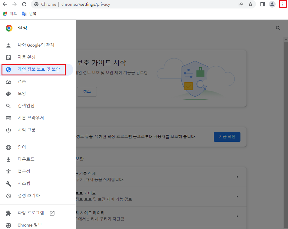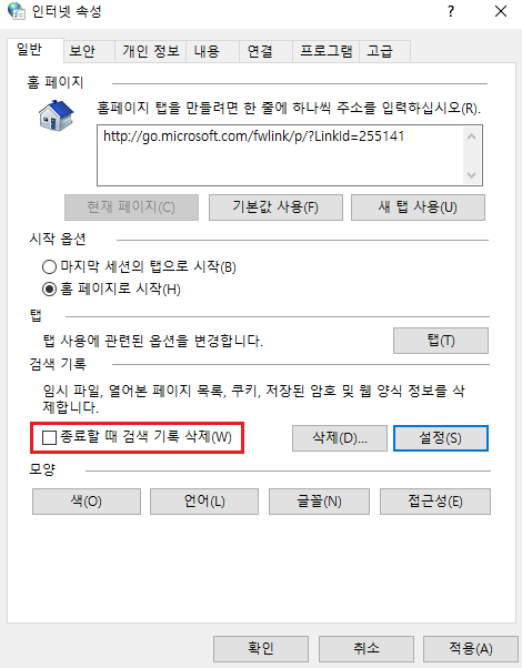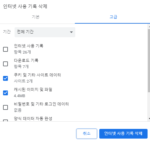 인터넷 사용 기록 삭제 > 기본 - 기간(전체기간), 인터넷 사용 기록(체크해제) / 고급 - 기간 (전체기간), 인터넷 사용 기록(체크해제), 다운로드 기록(체크해제)