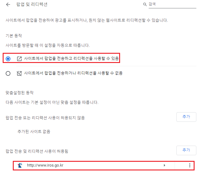 제어판 > 인터넷 속성 - 일반 : 종료할 때 검색 기록 삭제(체크해제) / 보안 : 신뢰할 수 있는 사이트 추가 (http://www.iros.go.kr) 및 아래 캡처처럼!