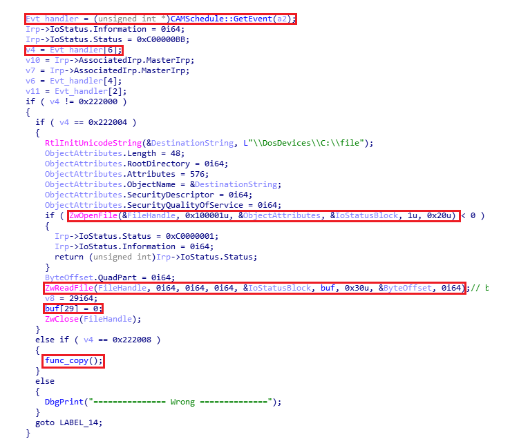 어쨌든 계속 분석을 해보면, 드라이버에서 파일을 열고 읽을 수 있는 Zw-File함수를 활용해 제공받은 file을 열고 읽어서 buf에 저장한다.