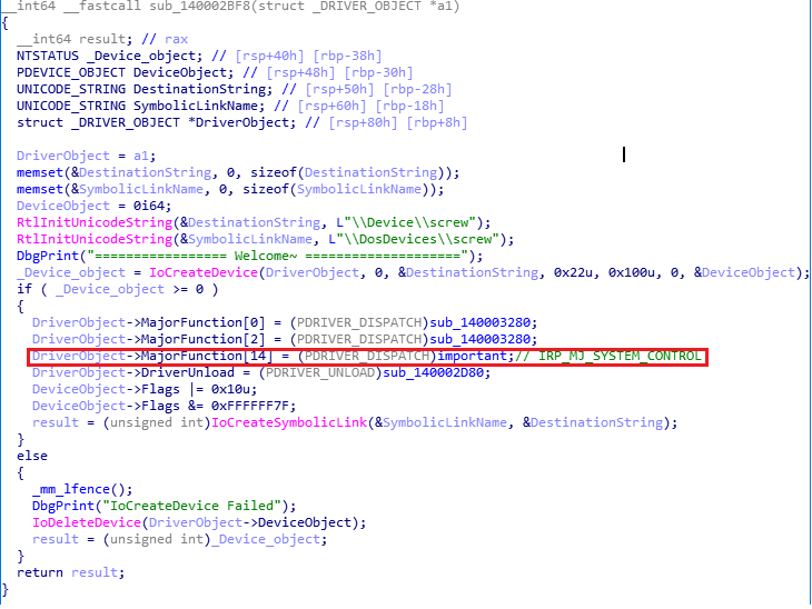 중요한 부분은 빨간박스 부분이다. MajorFunction의 14번째에 해당하는 내용은 IRP_MJ_SYSTEM_CONTROL을 호출한다.