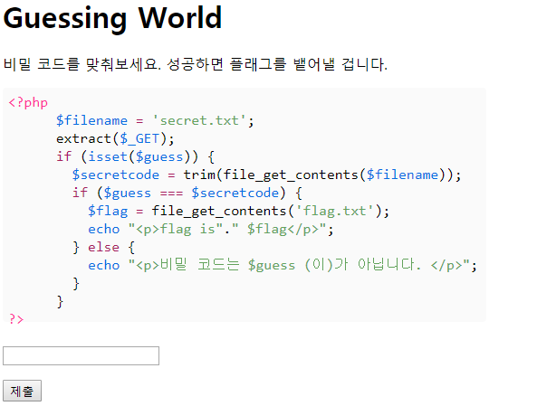 내가 $guess로 넣어준 값과 $filename 안에 있는 내용 즉, secret.txt의 내용이 같으면 flag를 출력해준다.