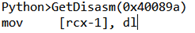 idc.GetDisasm(주소)( = idc.print_insn_mnem(주소)) : 해당 주소의 어셈블리 코드를 리턴