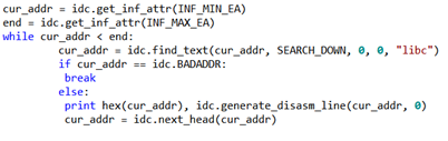 idc.find_text(주소, flag, y, x, 검색 문자열) : flag 의 조건에 따라 주소에서 부터 문자열을 검색
