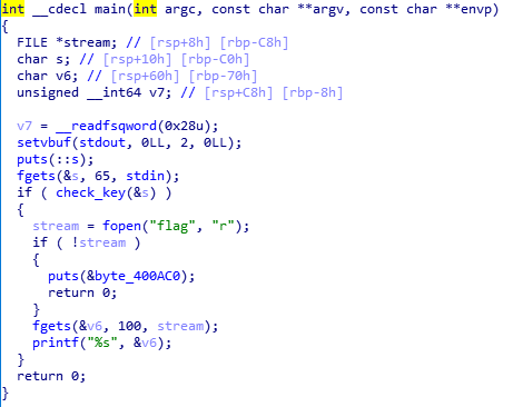 딱봐도 fgets로 문자열입력받고 check_key함수에서 값이 맞으면 flag를 출력해주겠군요.